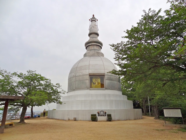 Da janela do nosso quarto, vê-se uma espécie de stupa branco (prateado) no meio do verde.