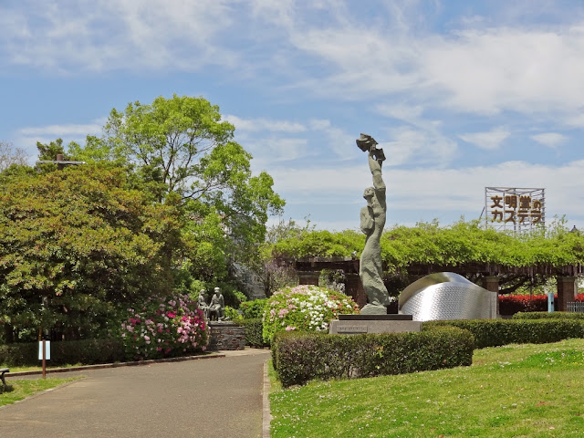 tem 9 metros de altura e foi completada dez anos após o bombardeamento de 1945. Com o braço direito aponta a ameaça das bombas nucleares e a posição do esquerdo simboliza a busca da paz. Perto, o epicentro da explosão