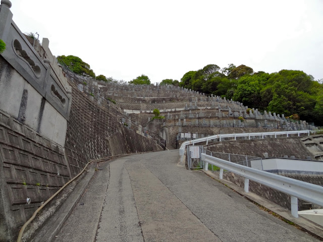 Fizemos paragem a um taxi e mostrámos-lhe a foto que vem no mapa da cidade. É o History Walk and Pagoda Hike. Por gestos, falando em português, respondendo o homem em japonês, lá nos levou até meio da montanha, deixando-nos junto de um grande cemitério de campas cinzentas, em socalcos.