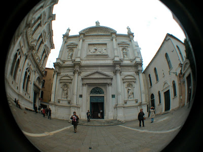 O recepcionista (continua impecavelmente vestido), ensinou-nos como vão os venezianos para San Samuele… Virámos imediatamente à esquerda do hotel, numa rua estreitinha, onde não passam turistas. Direitos à Igreja de S. Rocco. Aqui, entrámos. As paredes e os tectos estão recobertos por pinturas de Tintoretto (1518-1594), que foi confrade da Scuola Grande di San Rocco. Além de Tintoretto, estão presentes, também, obras de Sebastiano Ricci, Giuseppe Angeli, Pordenone e outros.