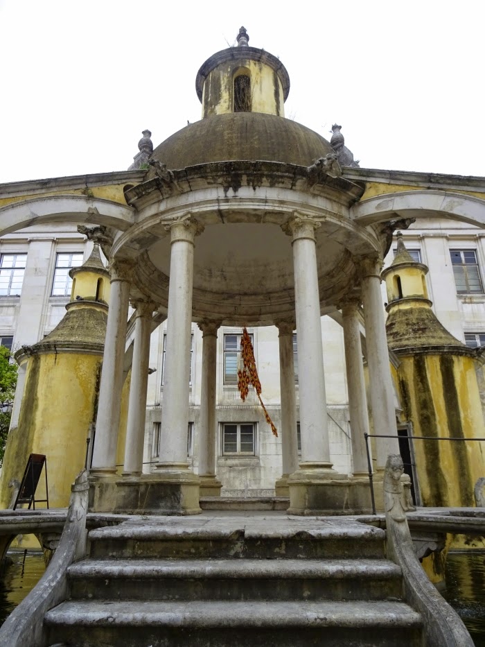 Também os estudantes de capa e batina, espalham o fado e deixam-se fotografar com os estrangeiros. Ao fundo, em ladeira bem acentuada que leva à traseira do Mosteiro de Santa Cruz, outro edifício fora do normal.